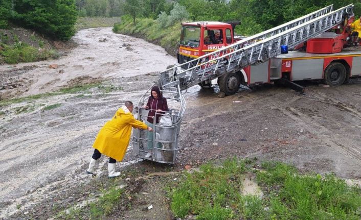 Çorum’un İskilip ilçesinde sağanak yağış sonrası oluşan sel sebebiyle mahsur kalan aileyi itfaiye kurtardı.