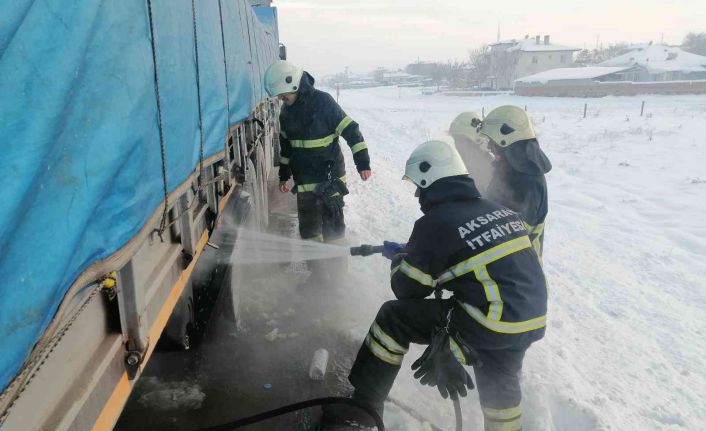 Aksaray’da sunta taşıyan tırın lastiğinin patlaması sonucu çıkan yangında dorse altındaki körükler yanarken, yangın karayolunda paniğe neden oldu.