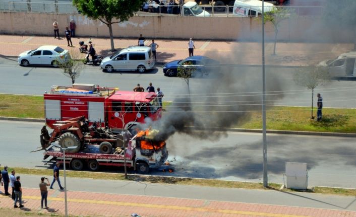 Antalya’da üzerinde traktör bulunan çekici seyir halindeyken alev alev yandı. İtfaiyenin müdahalesiyle söndürülen yangında çekicinin ön kısmı kullanılamaz hale geldi.
