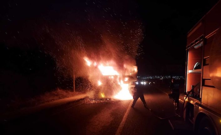 Antalya’da kapalı kasa kamyonette çıkan yangında kamyonetin motor bölümü kullanılamaz hale geldi.