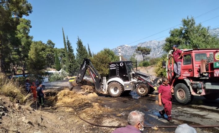 Olay, Serik ilçesine bağlı Gebiz Haciosmanlar mevkiinde meydana geldi. Edinilen bilgiye göre, sürücü Erşan Toklu, kamyonda yüklü olan saman balyaları arasında çıkan dumanı fark edince aracı park etti. Saman balyalarını damperi kaldırarak boşaltan sürücü durumu 112’ye haber verdi. Olay yerine gelen Gebiz Orman İşletmesine bağlı 2 arazöz ile itfaiye ekiplerine bağlı söndürme aracı geldi. Yanan balyalar söndürüldü. Ormana sıçramaması için ise kepçe yardımıyla balyalar gömüldü.Seyir halindeki kamyonda bulunan balyalar yandı