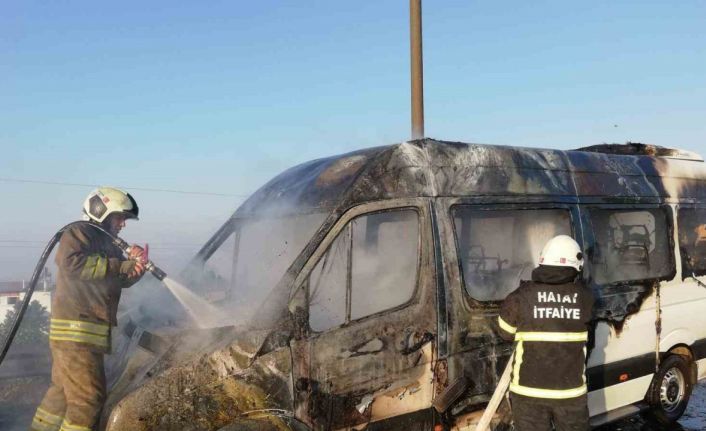 Hatay’da seyir halindeyken motor kısmı yanmaya başlayan minibüs alev alev yandı.