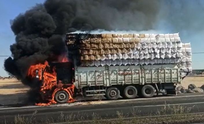 Şanlıurfa’nın Siverek ilçesinde seyir halindeki saman yüklü kamyon alev alarak yandı.