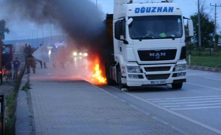 Karabük’ün Safranbolu ilçesinde seyir halindeki tırın dorse lastikleri alev alarak yandı.