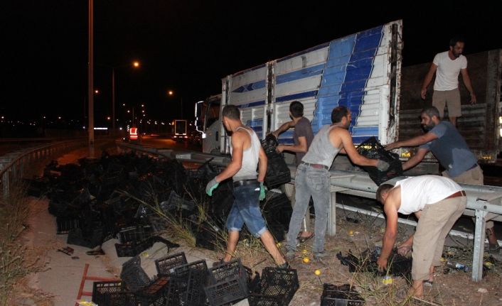 Mersin’in Erdemli ilçesinde, Mersin Adana Otoyolu Çeşmeli girişinde limon yüklü tır seyir halindeyken yükü kaydı, dorseden dökülen yüzlerce kasa limon otoyola saçıldı.