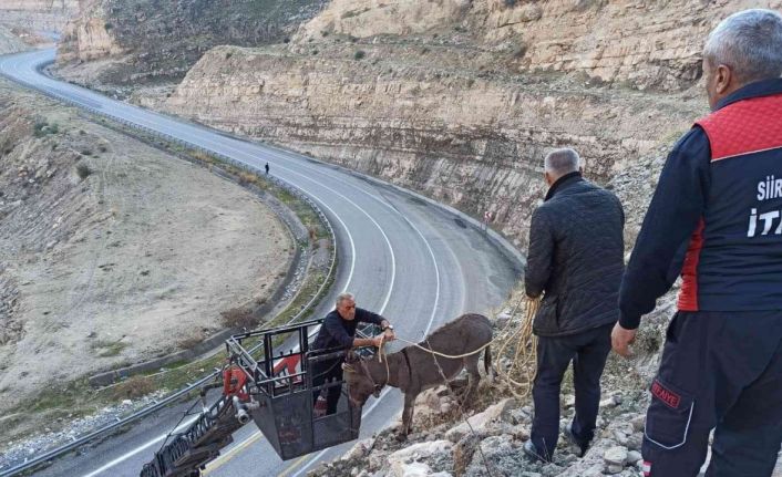 Siirt-Eruh karayolunda 5 gündür kayalıklarda mahsur kalan eşek, Siirt Belediyesine bağlı itfaiye ekipleri tarafından kurtarıldı.