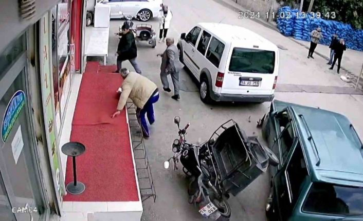 Edinilen bilgilere göre olay, dün akşam saatlerinde ilçe merkezinde 26 AHF 339 plakalı araç, sürücüsünün direksiyon hakimiyetini kaybetmesi sonucu önce park halindeki motosiklete, ardından yol kenarında bulunan marketin manav reyonuna çarparak durabildi. Kazada ölen ya da yaralanan olmazken, bir iş yeri önünde oturanların panik anları güvenlik kameralarına yansıdı.