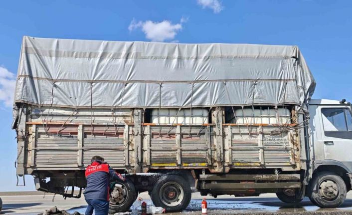 Aksaray’da seyir halindeyken balata sıkışması nedeniyle arka lastiği alev alan kamyondaki yangın itfaiye ekiplerinin müdahalesiyle söndürüldü.