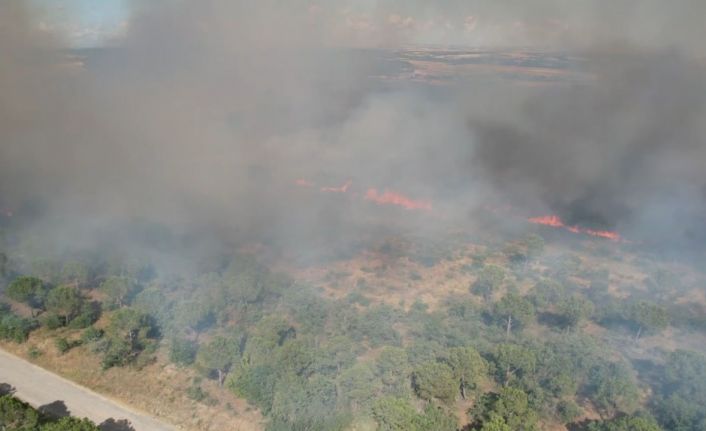 Silivri’de tarım alanlarında çıkan rüzgarın etkisiyle büyüyerek ormanlık alana sıçrayan yangını söndürme çalışmaları havadan ve karadan sürüyor.