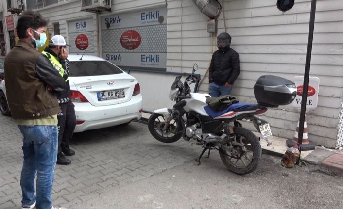 Sinop’ta tam kapanmanın ilk gününde denetimler sıklaştırıldı. Polis ekipleri sokağa çıkma kısıtlaması ve karantina ihlallerine de fırsat vermedi. Gelen ihbarları da değerlendiren ekipler ’pozitif bir şahsın motosikletiyle dolaştığı’ ihbarı üzerine alarma geçti. Saat 10.30 sıralarında gerçekleşen olayda 34 NT 0802 plakalı motosiklet, sürücüsü Deniz A. ile birlikte Nalbant Sokak üzerinde durduruldu. Ekipler şahsı bir süre güvenli mesafede bekletti.