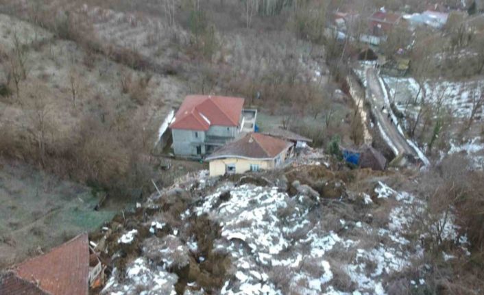 Bölgede jandarma ekipleri geniş güvenlik tedbiri aldı. Heyelan bölgesi dron ile görüntülendi. Görüntülerde, dev toprak kitlesinin kayarak evleri sürüklediği görülüyor.