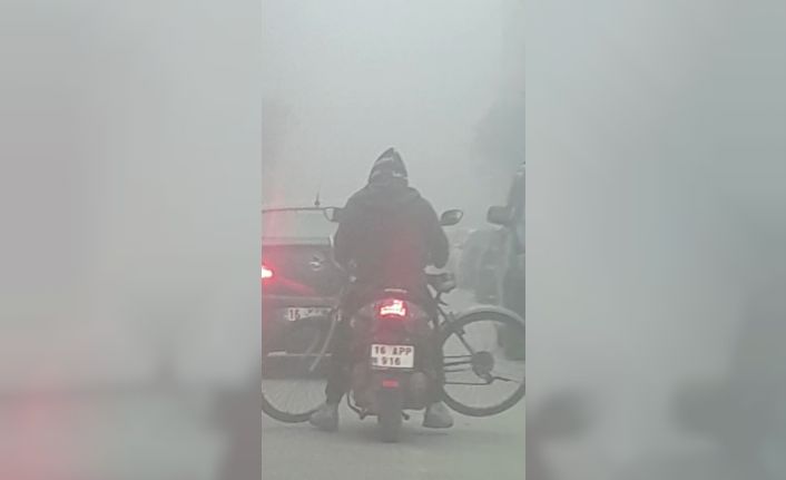 Bursa’nın İnegöl ilçesinde sabahın erken saatlerinde çöken sis sürücülere zor anlar yaşattı. Trafikte ilerleyen motosiklet sürücüsü ise taşıdığı bisiklet ile tehlike saçtı. Bir başka sürücü o ânları cep telefonu kamerasıyla kaydetti.