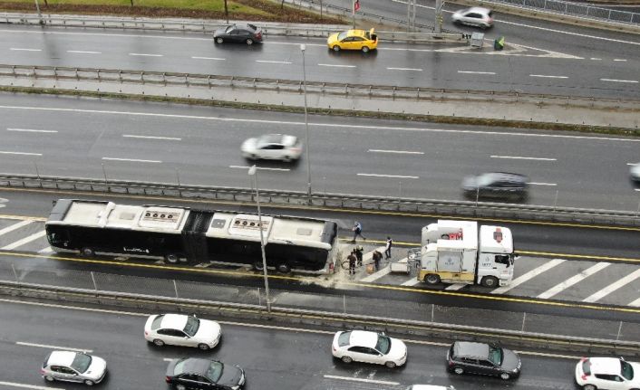 Şişli’de seyir halinde olan metrobüsün motor kısmında yangın çıktı. Yangın olay yerine gelen belediye ekipleri tarafından söndürüldü. Bir süre aksayan metrobüs seferleri normale döndü. Havadan çekilen görüntülerde metrobüsün motor kısmının yandığı ve trafiğin normal seyrine döndüğü görüldü.