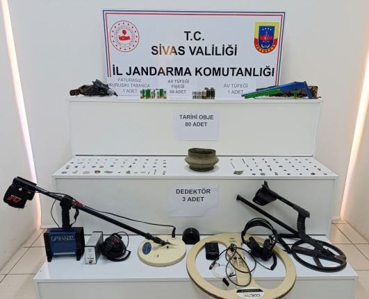 Gürün ilçesinde 4 ayrı adreste yapılan çalışmalarda ise; 3 detektör, 80 adet tarihi eser niteliği taşıyan sikke, 1 ruhsatsız av tüfeği, 1 kurusıkı tabanca ve 68 av tüfeği fişeği ele geçirildi. Olaya karışan 3 şüpheli şahıs gözaltına alındı.
