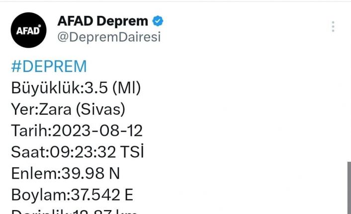 Sivas’ın Zara ilçesinde 3.5 büyüklüğünde bir deprem meydana geldi.