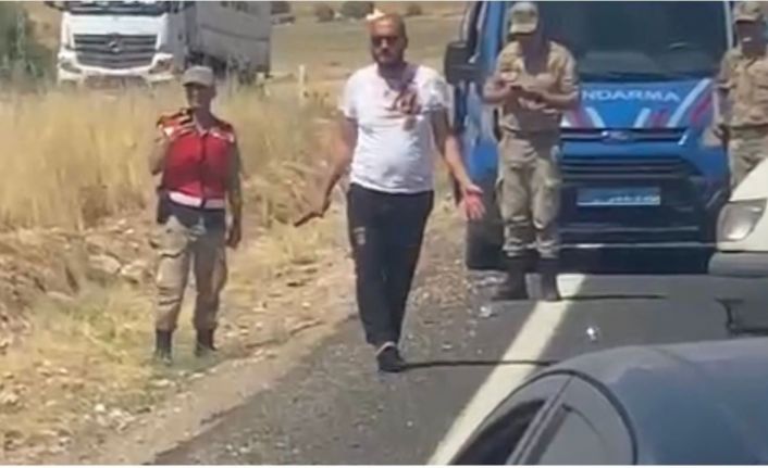 Dakikalarca sıcakta beklemek zorunda kalan sürücüler şahsı ikna edemeyince, sürücüler ve şahıs arasında tartışma çıktı. Sürücülerden bazıları, yolu kapatan şahsa, taş ve tekmelerle saldırdı. Jandarma havaya ateş açarak olaya müdahale etti. Güçlükle müdahale edilen ismi öğrenilemeyen şahıs, kelepçelenerek gözaltına alındı.