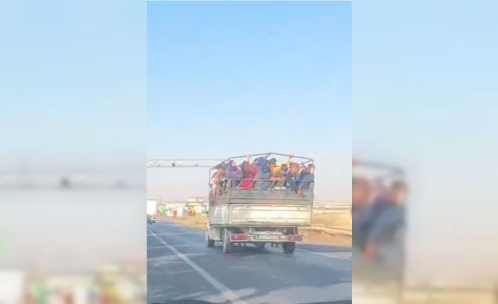 Görüntülerde, işlek bir karayolunda ilerleyen pikabın kasasında güvenlik önlemi olmadan yolculuk eden çok sayıda işçi olduğu görüldü. Trafik kurallarını ve can güvenliğini hiçe sayan sürücü, tüm uyarılara rağmen yoluna devam etti.