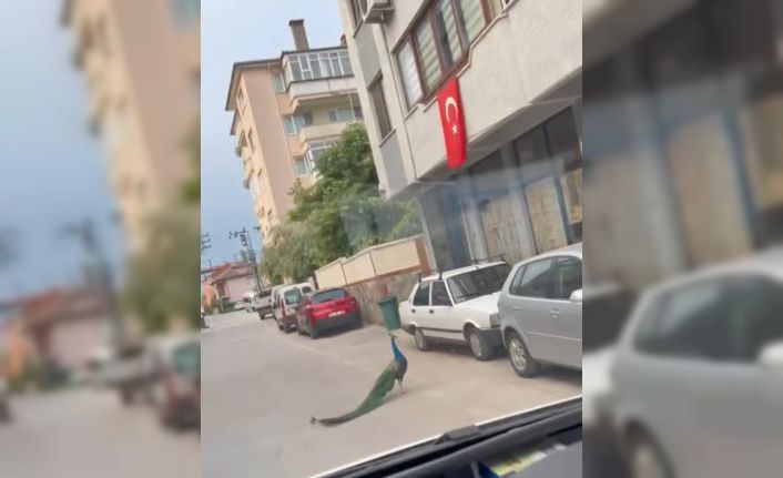 Sokak ortasında gezen tavus kuşu sürücülere ilginç anlar yaşattı