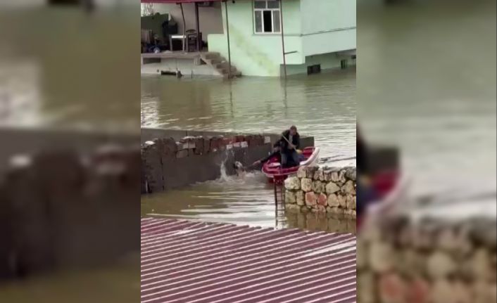 Diyarbakır’ın Kocaköy ilçesinde sağanak yağış nedeniyle meydana gelen taşkında evde mahsur kalan köpek, bota binen vatandaşların yardımıyla kurtarıldı.