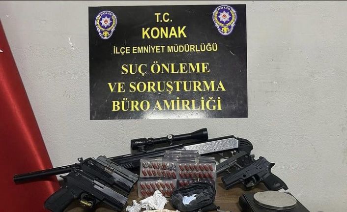Konak İlçe Emniyet Müdürlüğü Suç Önleme ve Soruşturma Büro Amirliği ekipleri, kentte çok sayıda hırsızlık olayına karışan ve hakkında hapis cezası bulunan T.G. adlı şüphelinin adresini belirledi. Belirlenen adrese operasyon gerçekleştiren polis ekipleri, T.G.’yi kıskıvrak yakalayarak gözaltına aldı. Adreste yapılan aramada ise, 5 ruhsatsız tabanca, 1 ruhsatsız tüfek ve uyuşturucu Maddeler ele geçirildi.