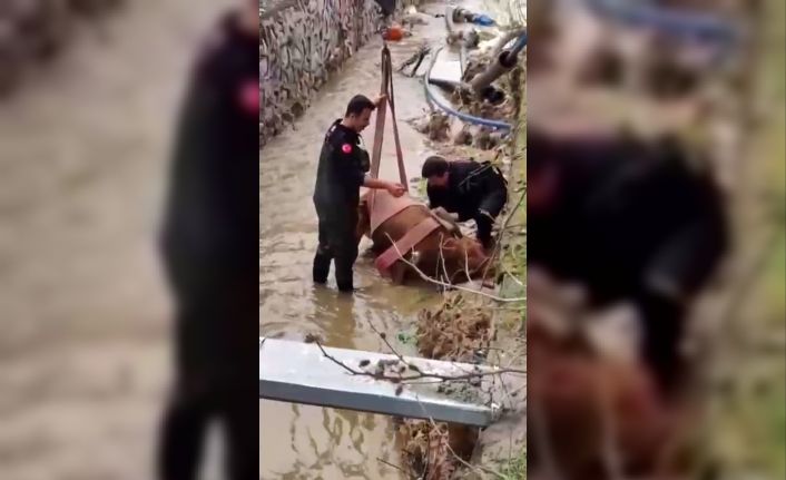 Sulama kanalına düşen ineği itfaiye kurtardı