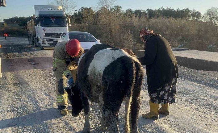 Arnavutköy’de hayvanlarını otlaması için çayırlık araziye çıkartan yaşlı kadının bir ineği sulama kanalına düştü. İneği düştüğü yerden itfaiye ekipleri çıkarırken, yaşlı kadın saatlerce hayvanının başından ayrılmadı.