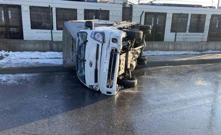 Sultangazi’de sürücüsünün direksiyon hakimiyetini kaybettiği kamyonet kaldırıma çarparak yan yattı. Kaza sonrası duyarlı bir vatandaş, başka kaza olmaması için el hareketleriyle trafiği yavaşlatmaya çalıştı.