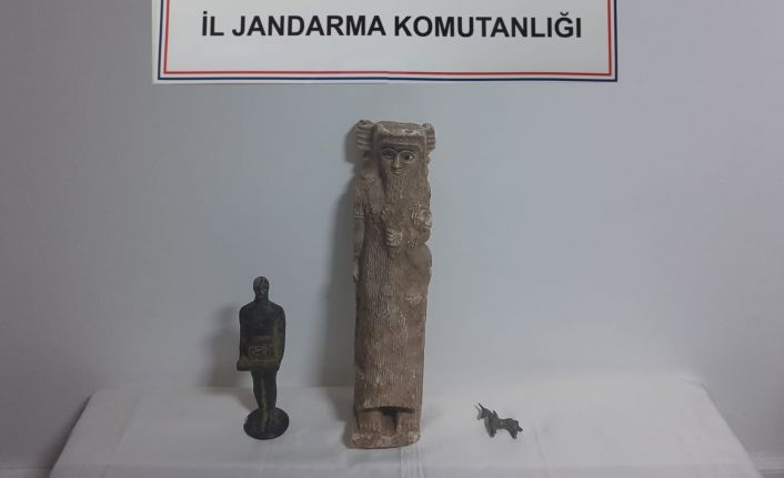 Şanlıurfa’da Sümerler dönemine ait 3 heykeli satmaya çalışan 2 zanlı, alıcı gibi davranan jandarma tarafından yakalandı.
