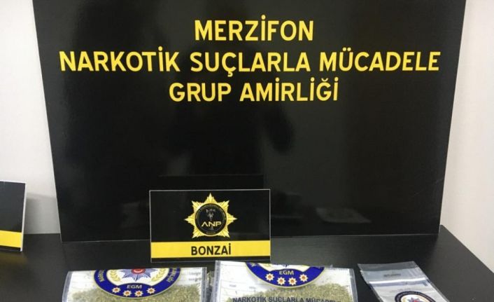 Amasya’nın Merzifon ilçesinde durumundan şüphelenilen bir araçtan kannabinoid (bonzai) ve Afyon sakızı ele geçirildi.