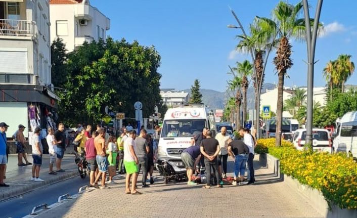 Muğla’nın Marmaris ilçesinde sürücüsünün ani fren yaptığı motosiklet takla attı. Kazada 2 kişi yaralanırken kaza anı güvenlik kameralarına yansıdı.