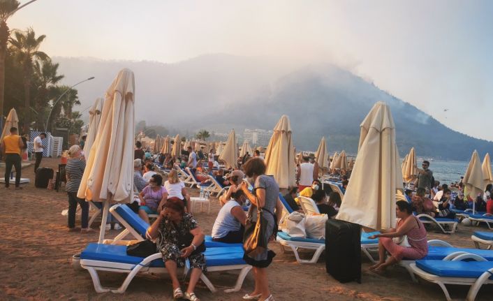 Muğla’nın Marmaris ilçesinde çıkan orman yangını nedeniyle boşaltılan otellerdeki yerli ve yabancı turistler sahil bölgesine getirildi.