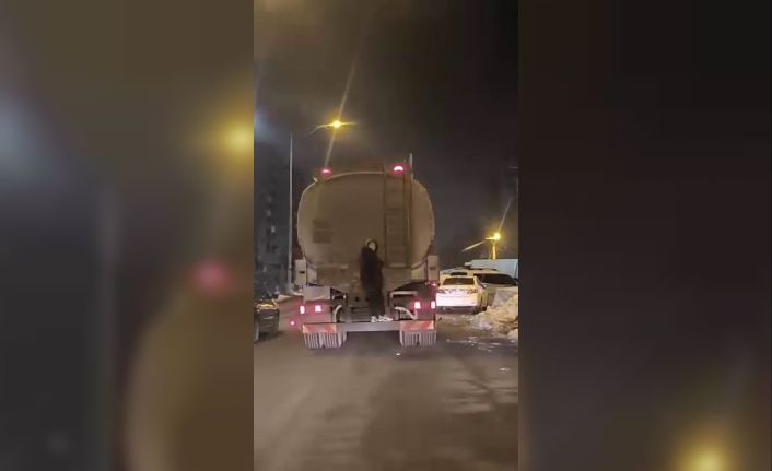 Diyarbakır’da tankerin arkasına takılan çocuk, hem canını hem trafiği tehlikeye attı. O anlar cep telefonu kamerasına yansıdı.