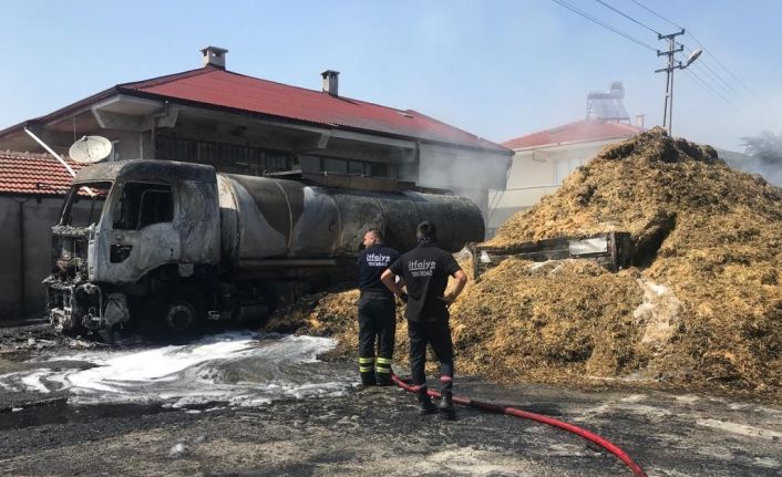 Tekirdağ’ın Ergene ilçesinde çıkan yangında saman yüklü tır ve tanker alev alev yandı.