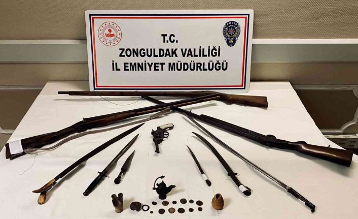 Edinilen bilgiye göre Zonguldak İl Emniyet Müdürlüğü KOM Şube Müdürlüğü tarafından Ş.C. isimli şahsın tarihi eser niteliği taşıyan ürünleri ikametinde ve iş yerinde bulundurduğuna yönelik istihbari bilgiler elde edilmesi üzerine harekete geçti. Ekipler Ş.C. isimli şahsın ikametinde ve iş yerinde yapılan aramada, 3 adet tüfek, 1 adet tarihi toplu tabanca, 12 adet sikke, 4 adet tarihi obje, 4 adet kama ,3 adet kılıç, 2 adet tabanca fişeği (9 mm - 7.65 mmm, 9 adet 16 Cal. av tüfeği fişeği ele geçirildi. Ekipler tarafından gözaltına alınan Ş.C. isimli şahıs hakkında adli işlem başlatıldı.