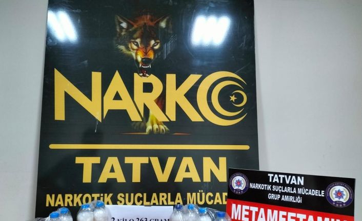 Bitlis Valiliğinden yapılan açıklamada, Tatvan İlçe Emniyet Müdürlüğü narkotik ekiplerince durdurulan bir araçta arama yapıldığı belirtildi. Açıklamada, “Yapılan aramada 9 parça halinde pet şişeler içerisinde toplam 2 kilo 263 gram metamfetamin maddesi ele geçirilmiş, olayla ilgili bir şüpheli hakkında adli işlemlere başlanılmıştır. Uyuşturucu madde imalatı, kaçakçılığı ve kullanımına karşı yürütülen kararlı mücadelemiz devam edecektir” denildi.