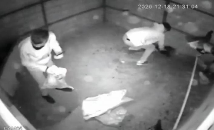 Bursa’da bir kümesten tavuk çalan hırsızlar, tavukları çuvala doldurup kaçamaya çalışması güvenlik kamerasına yansıdı.