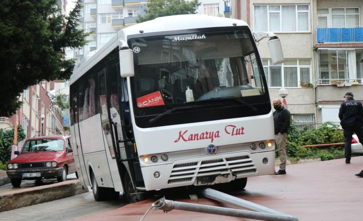 Samsun’da yağmurun etkisiyle kayganlaşan yolda direksiyon hakimiyetini kaybeden sürücünün kullandığı servis midibüsü aydınlatma direğine vurup, kaldırıma çıktıktan sonra durabildi.