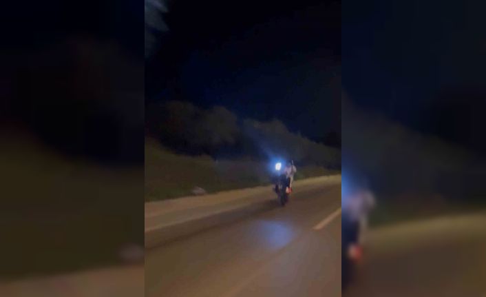 Bursa’da bir motosiklet sürücüsü anayolda ön tekeri kaldırıp, kilometrelerce ilerledi. Sürücünün tehlikeli yolcuğu kameraya saniye saniye yansıdı.