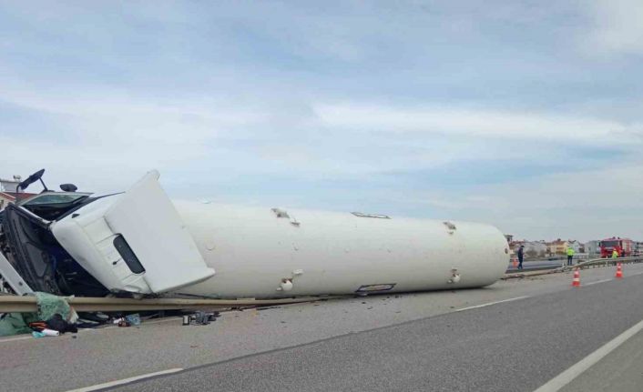 Tekirdağ’da seyir halindeki doğalgaz yüklü tanker devrilirken aracın sürücüsü yaralandı.