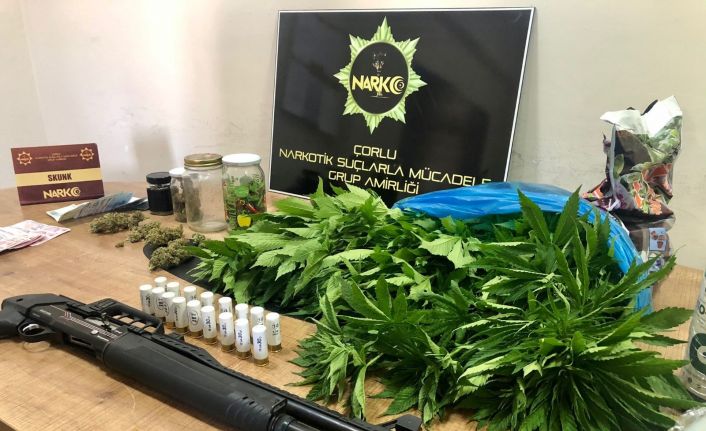 Tekirdağ İl Emniyet Müdürlüğü Narkotik Suçlarla Mücadele ekiplerimce Tekirdağ’ın 4 ilçesinde evde kenevir yetiştirenlere yönelik operasyon düzenlendi. Gerçekleştirilen eş zamanlı operasyonda Çorlu, Saray, Süleymanpaşa ve Şarköy İlçesinde hedef 11 şahsın ikametinde arama yapıldı. Aramalarda, 5 şahsın ikametinden 2 adet hint keneviri bitki yetiştirme dolabı, 113,8 gram kubar esrar, 37 kök halinde hint keneviri bitkisi, 10 gram kenevir bitki tohumu, 2 adet sarma kağıdı, 2 bin 250 litre sıvı gübre, 2 kilogram katı gübre, 1 adet ruhsatsız pompalı tüfek, 17 adet av tüfek fişeği, 5 bin suçtan elde edildiği değerlendirilen para bulunarak el konuldu.