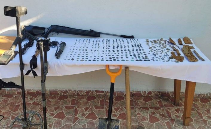 Yapılan aramalarda 26 kök kenevir bitkisi, 488 gram kubar esrar, 3,8 gram toz esrar, 1.348 gram bonzai, 2,4 gram metamfetamin, 240 gram kenevir tohumu, 1 adet hassas terazi, 1 adet uyuşturucu kullanma aparatı (payp), 1 adet cep telefonu, 3 adet dedektör, 432 adet obje ve sikke, 1 adet tahkim edevat kürek, 1 adet kazma, 2 adet el küreği, 1 adet dürbün, 1 adet tabanca, 7 adet tabanca fişeği, 1 adet havalı tüfek ve 1 adet kama ele geçirildi.