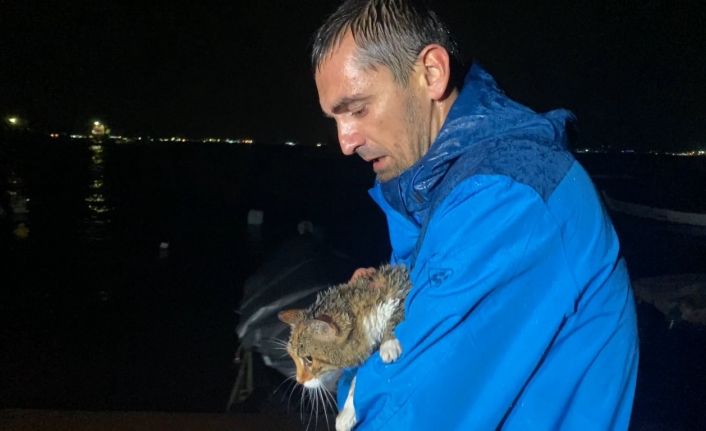 Kocaeli’nin Darıca ilçesinde etkili olan fırtına sonrasında deniz taştı, sahil sular altında kaldı. Teknelerini kurtarmak için sahile gelen vatandaşlar, dev dalgaların arasında kalan bir kediyi de kurtararak sahilden uzaklaştırdı.