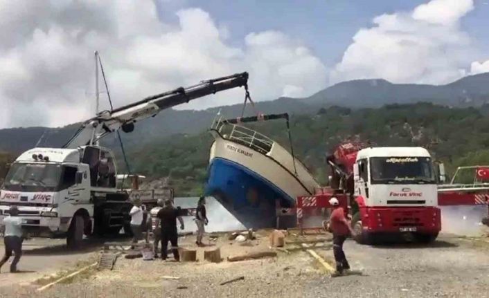 Olay, Ortaca’nın dünyaca ünlü tatil beldesi Dalyan Mahallesi’nde meydana geldi. Kıyıda bakımı yapıldığı öğrenilen bir tekne, yaz sezonu öncesi kanala indirilmek için iki adet kamyon vinç ile suya indirilmek için zincirlerle bağlandı.
