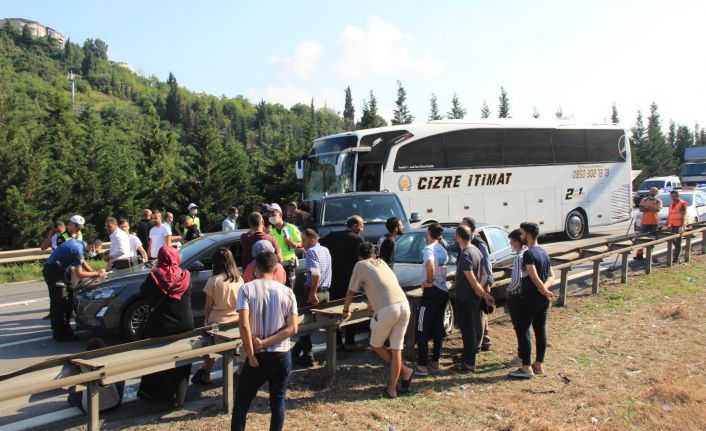 Kocaeli’nin İzmit ilçesi TEM Otoyolu’nda 3 otomobil ve şehirler arası yolcu otobüsünün karıştığı zincirleme trafik kazasında 4 kişi yaralandı. Kaza sebebi ile trafiğe kapanan yolda, uzun araç kuyrukları oluştu.