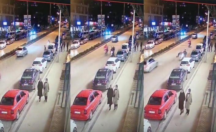 Kaza anı ise bölgede bulunan bir iş yerinin güvenlik kameralarına yansıdı. Görüntülerde, kazanın ardından ne olduğunu anlayamayan yayanın, çarpışmanın şiddeti sonrasında ayağa kalkarak etrafına baktığı, sonrasında ise kendisine çarpan motosiklet sürücüsüne yardım ettiği görülüyor. Kazada motosiklet sürücüsü hafif yaralanırken, ters şeride girme sonucunda oluşan kaza sonrasında inceleme başlatıldı.