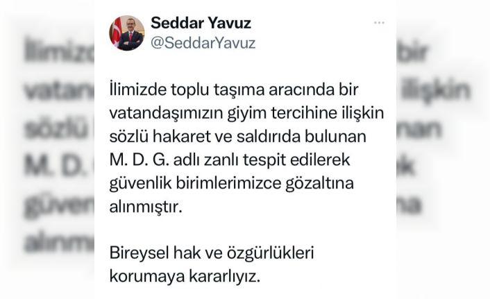 Kocaeli Valisi Seddar Yavuz, sosyal medya hesabından yaptığı açıklamada, "İlimizde toplu taşıma aracında bir vatandaşımızın giyim tercihine ilişkin sözlü hakaret ve saldırıda bulunan M.D.G. adlı zanlı tespit edilerek güvenlik birimlerimizce gözaltına alınmıştır. Bireysel hak ve özgürlükleri korumaya kararlıyız" dedi.