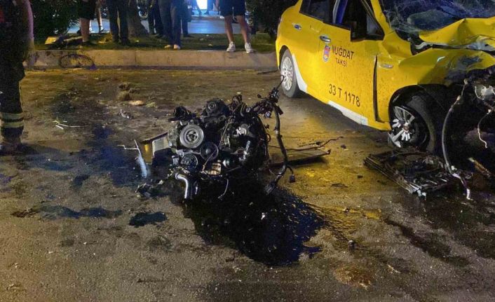 Mersin’de refüje ve ağaca çarpan ticari taksinin motoru yerinden fırladı.