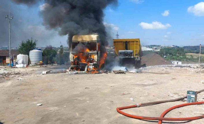 Kocaeli’nin Gebze ilçesinde bir geri dönüşüm fabrikası sahasında bulunan tır alevlere teslim oldu.