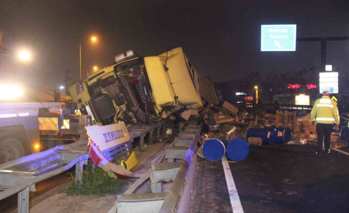 Kocaeli’de sürücüsünün direksiyon hakimiyetini kaybettiği tır, bariyerlere çarparak durabildi. Dorsede bulunan variller yola saçıldı, tır ise kullanılamaz hale geldi.