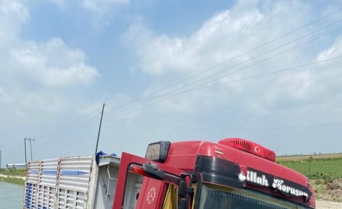 Mersin’in Tarsus ilçesinde sürücüsünün direksiyon hakimiyetini kaybettiği tır sulama kanalına düştü.